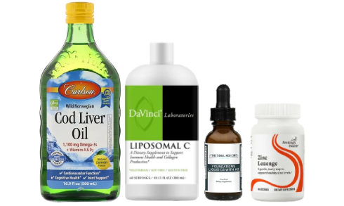 - Immune-boosting essentials like Vitamin C, zinc lozenges, and liquid D3 with K2