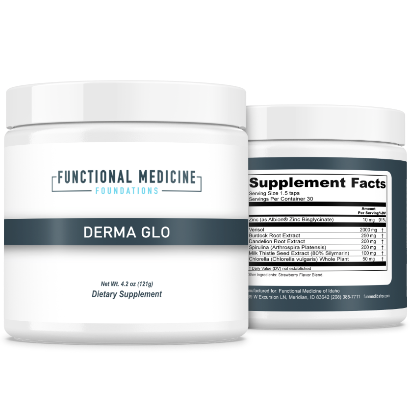 DermaGlo is specially formulated by Functional Medicine of Idaho to promote healthy skin and support natural detoxification to reduce skin flare-ups. Packed with potent natural ingredients, DermaGlo nourishes your skin from within, providing antioxidant protection to improve skin texture and tone.