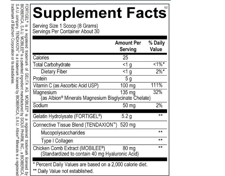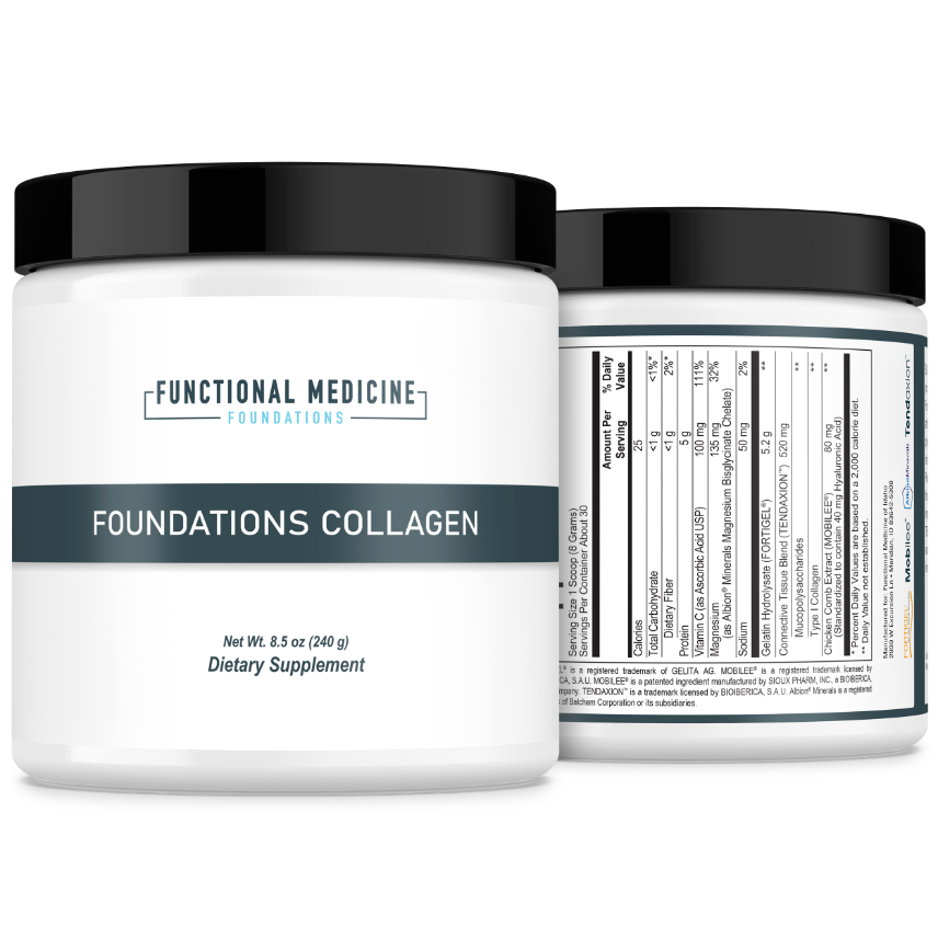 Foundations Collagen includes three clinically studied ingredients to support the natural healing process and maintain connective tissue structure. Most therapies simply block joint pain and connective tissue discomfort from exercise, and in doing so inhibit the regeneration and elongation of specific polysaccharide precursors and deplete nutrients, such as magnesium and vitamin C, that maintain joint and connective tissue health. FORTIGEL®, Tendaxion® and Mobilee® may help protect and preserve cartilage, tendons, ligaments, fascia, bone and the intervertebral discs of the spine.
