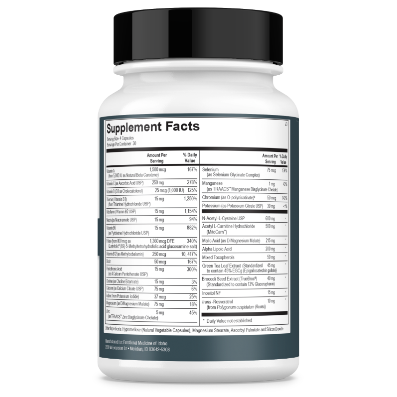 Foundations MitoMulti is a comprehensive, high-potency multivitamin and mineral formula designed to fuel cellular energy and foundational wellness. Thoughtfully crafted to be free of allergens derived from gluten, yeast, and artificial colors or flavors, this advanced blend is ideal for individuals seeking clean, science-backed daily support. Featuring essential nutrients in bioavailable forms, Foundations MitoMulti promotes mitochondrial function, antioxidant protection, and overall vitality. Whether you're navigating a demanding lifestyle or simply aiming to optimize your nutrient intake, this powerhouse formula provides the daily support your body needs, without compromise.