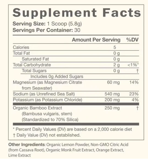 This is more than JUST an electrolyte drink. It’s loaded with essential trace minerals that hydrate the cells, skin, and tissues for full body hydration. With unrefined sea salt from Utah and magnesium harvested from seawater off the coast of Ireland, this comes packed with an abundance of natural trace minerals that our body needs for proper electrolyte balance and cellular function. It is then topped off with some bamboo which is one of natures highest sources of silica. Silica can help support bringing hydration to the skin and tissues.