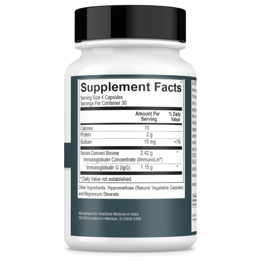 Gut Immune IgG 120ct is the only purified, dairy-free source of immunoglobulin G (IgG) available as a dietary supplement. Pure IgG helps to maintain a healthy intestinal immune system by binding a broad range of microbes and toxins within the gut lumen.