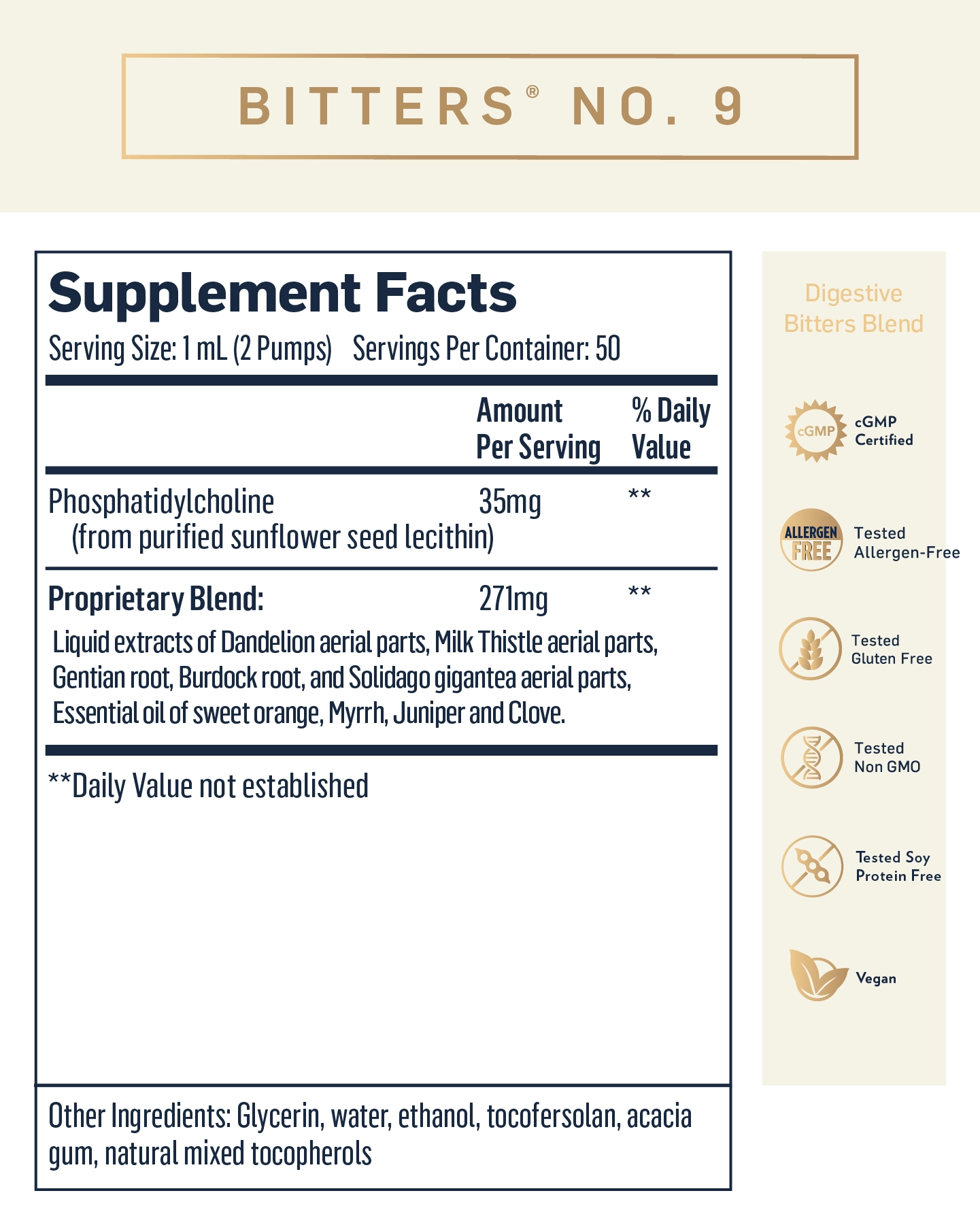 - Nine bitter herbs and essential oils, all known to help activate bitter receptors and to be able to support bile flow and healthy digestion.*